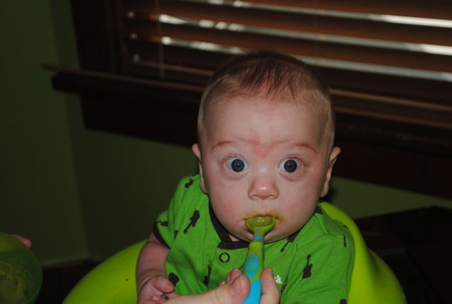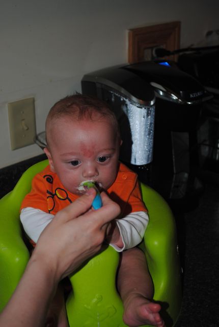 Jack LOVES eating. Loves it. So far he’s only had rice cereal and asparagus (I’m neurotic, and make my own baby food). I was a little nervous about starting veggies, thinking there would be lots of spitting out, gagging, etc. But nope, J loves his asparagus!