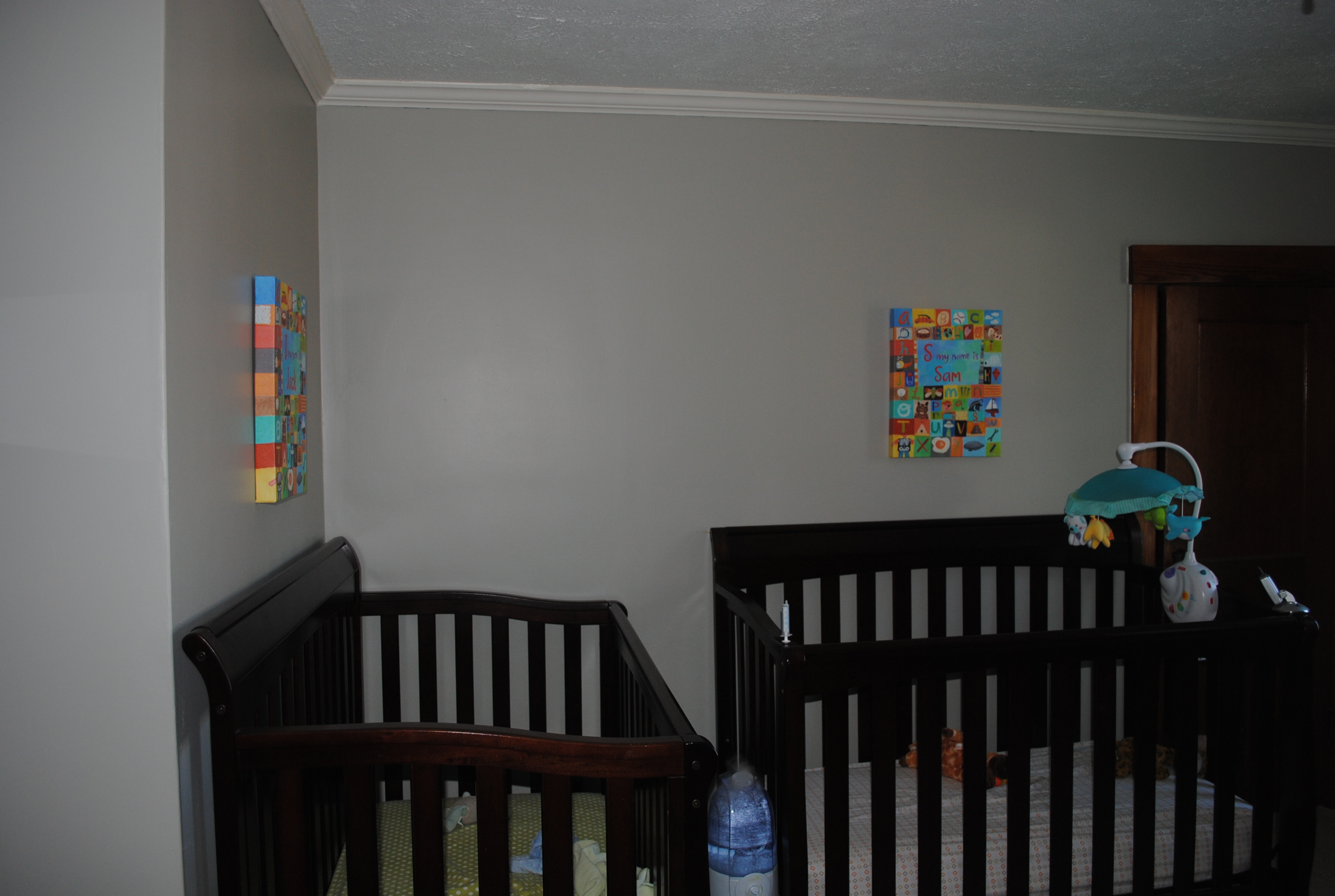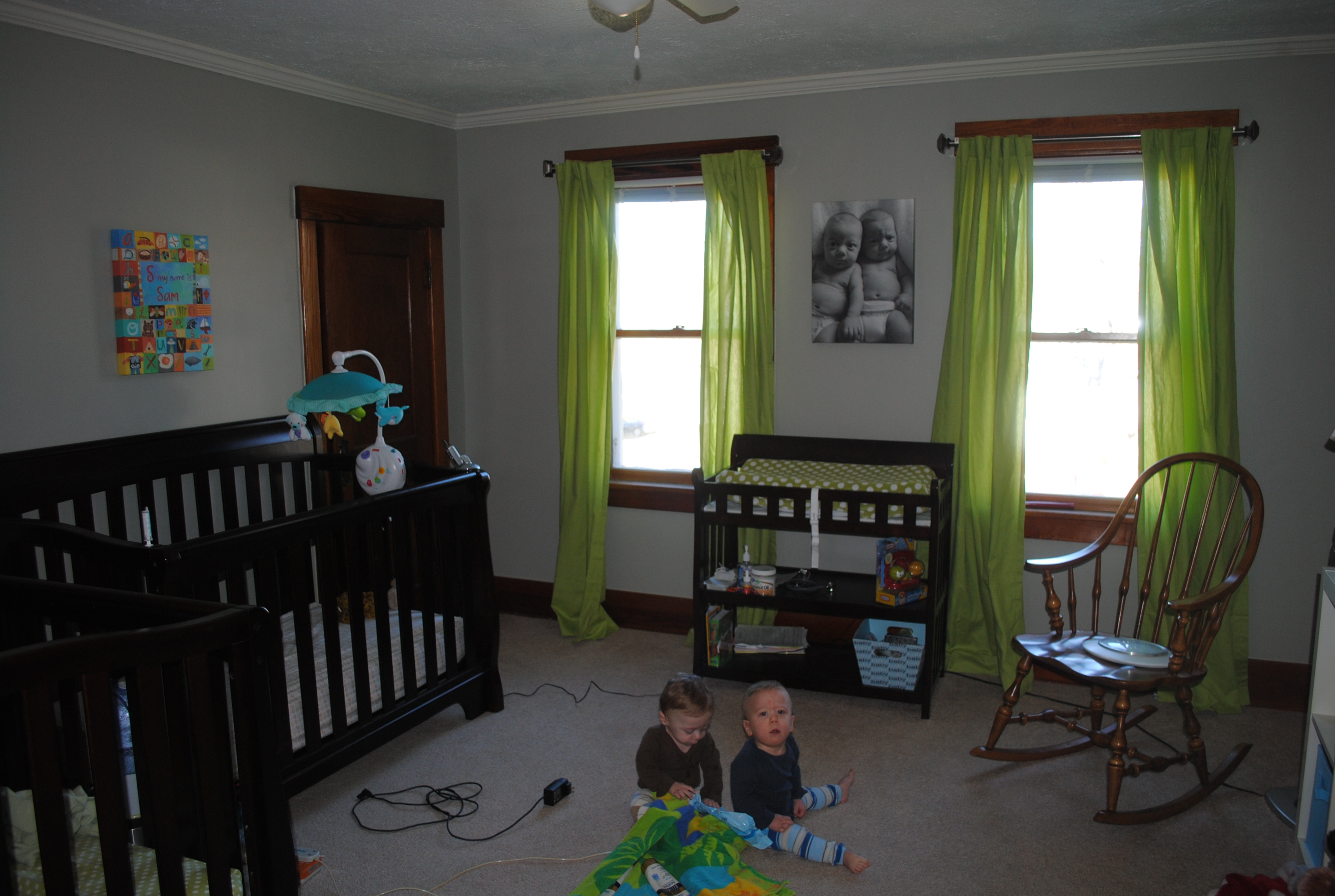 I have never posted pictures of their room… Here it is! It’s usually pretty dark in there; I keep the curtains closed because the only time they are in there is either naptime or bedtime.
