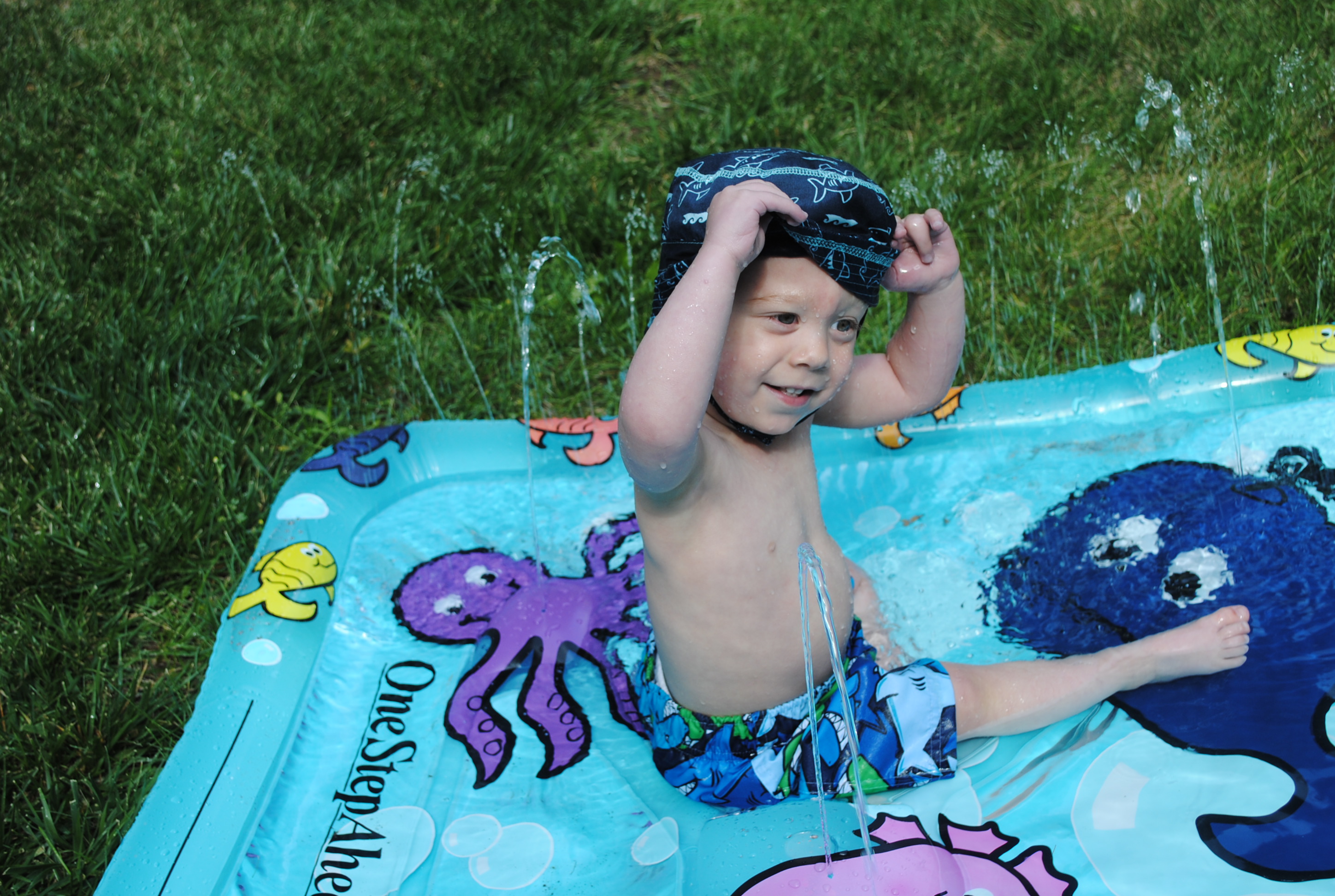 My dad arrived in Omaha Friday evening and we grilled– Adam even made it home in time for a late dinner! He had to round Saturday morning, but once he was home we loaded the boys up and headed to Village Pointe. We were on a mission to find a pair of Nike sandals for the boys (for sizing purposes) but Scheels was sold out. So we made do with playing at the water ball (?)– I have no idea what to call it!
