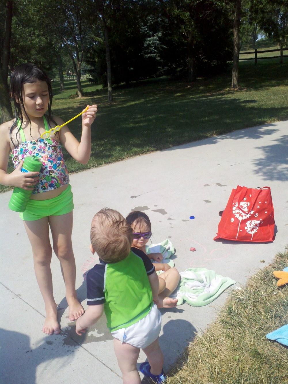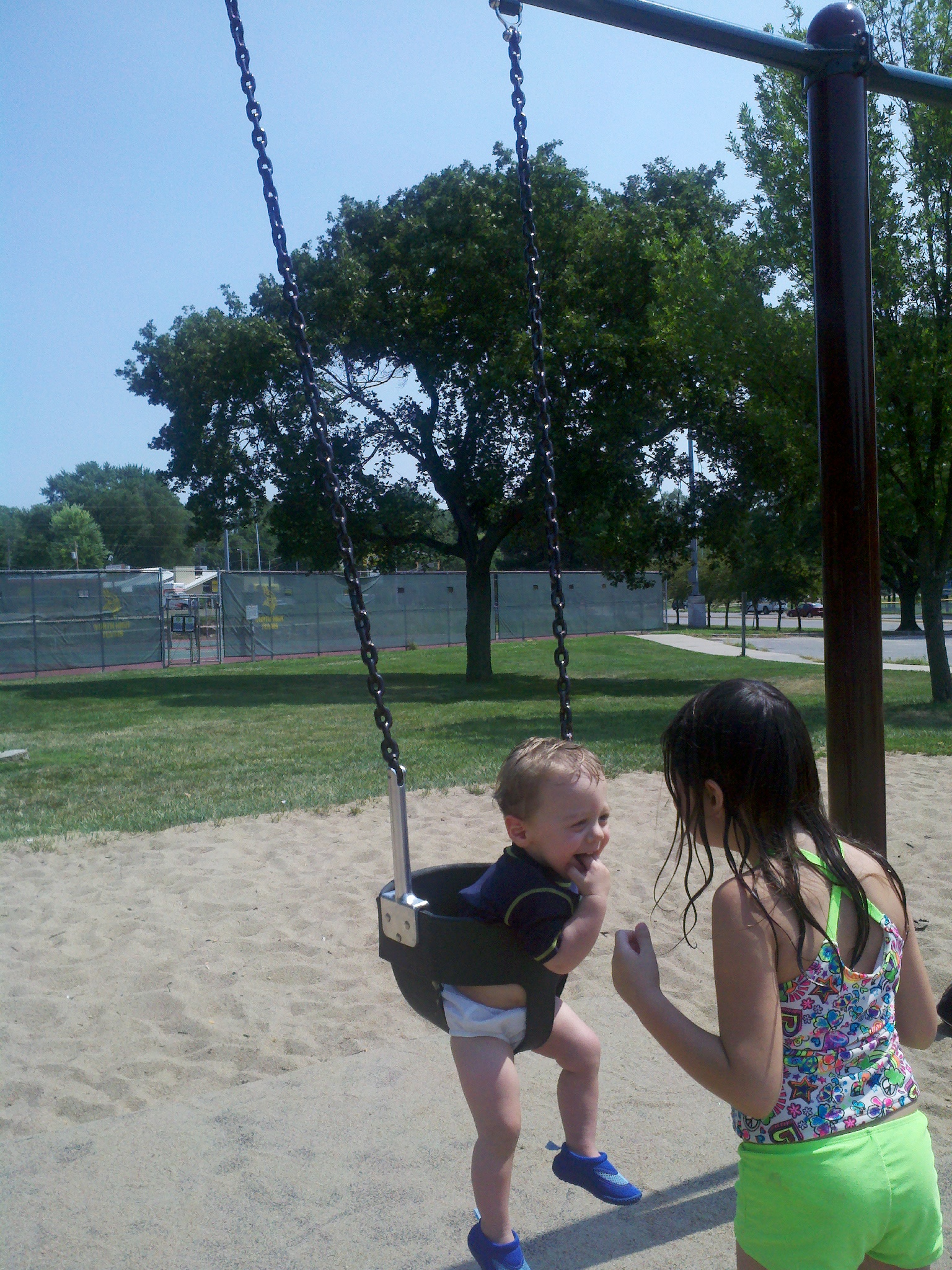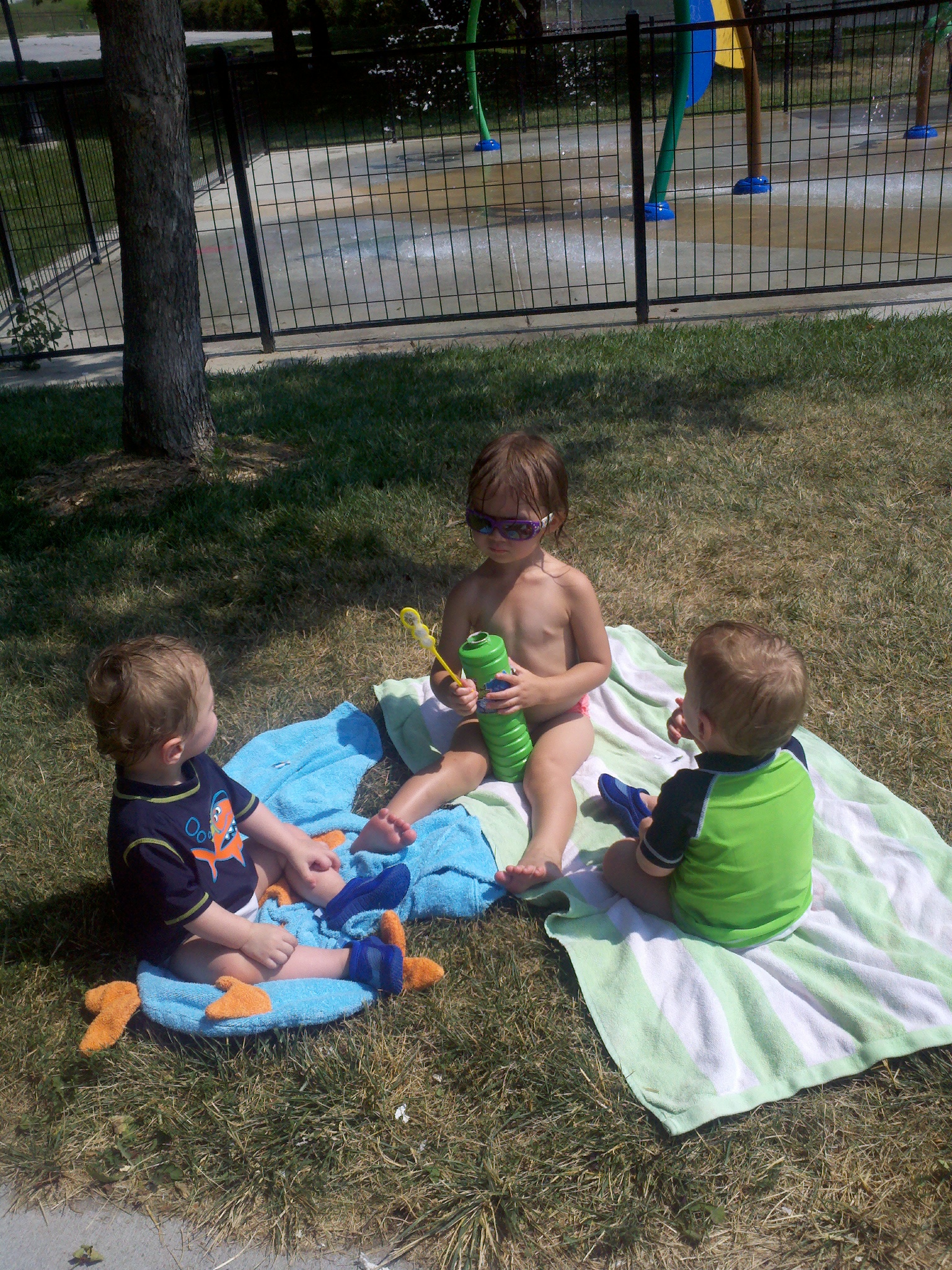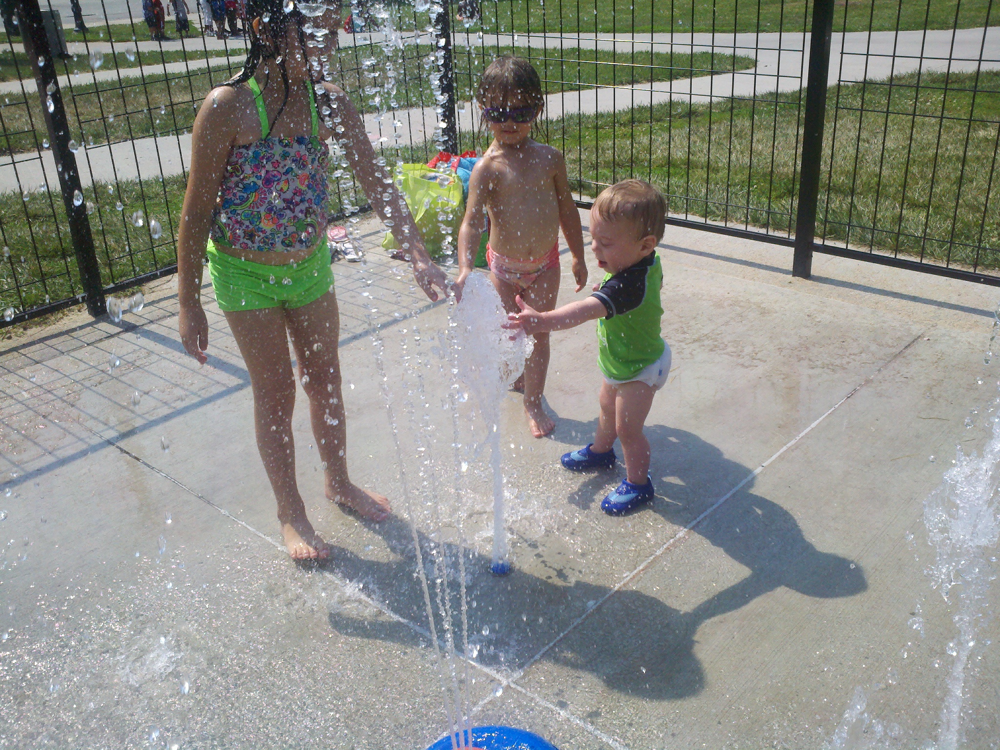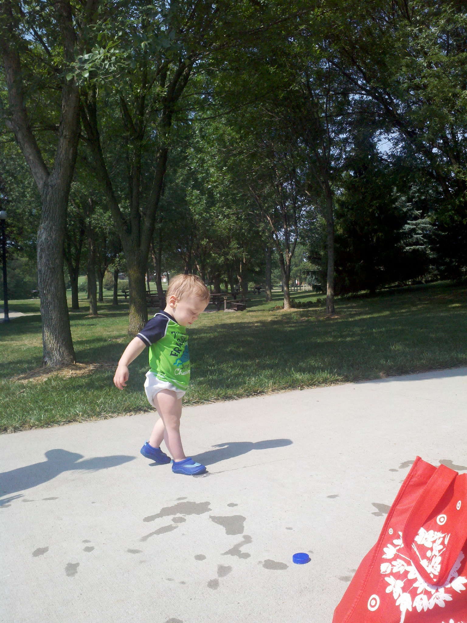 On Tuesday, my awesome Aunt Stef and 2 of her girls, Mary and Kate, drove up from Lincoln, NE to go to a local splash park and have lunch with us! Jack had absolutely no fear and started walking to the water as soon as Stef set him down. Meanwhile, Sam and I strolled around and he ended up loving the water! He even “walked” with me for a good 20 minutes, and did really well. Stef got some great pics on her phone: