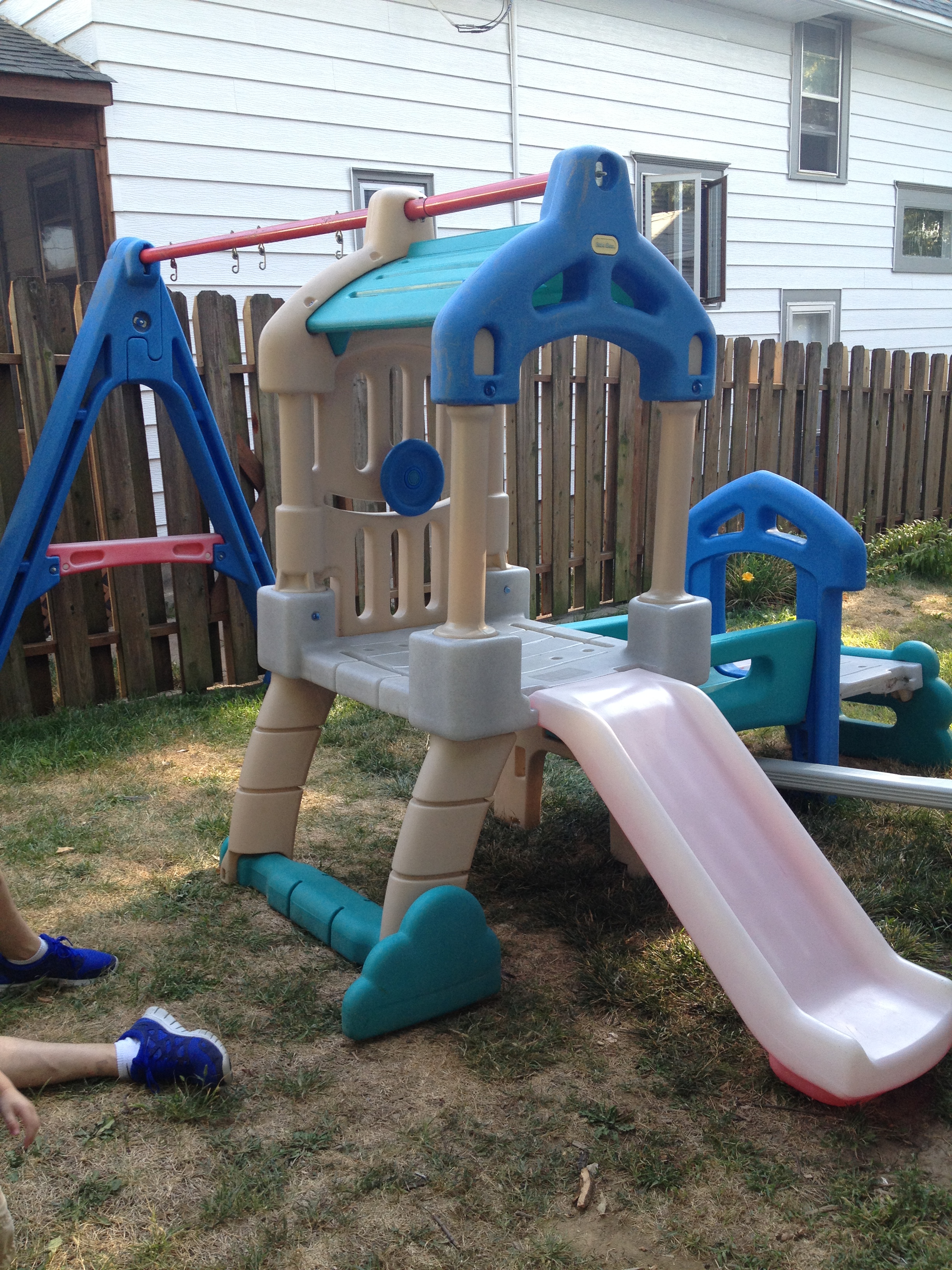 The past few days have been incredibly productive! Wednesday afternoon I found an awesome swingset/playset on Craigslist. $80! Couldn’t pass this thing up. So once Adam got home, we loaded the boys in the van and headed to Missouri Valley, IA (small town USA). The family selling it was incredibly sweet, and we almost felt bad taking it from them! One of their little girls followed us to the van as we were leaving and asked if she could come and play with us 😦 Adam set up the swingset today, and now we just need to get 2 swings and we’ll be set!