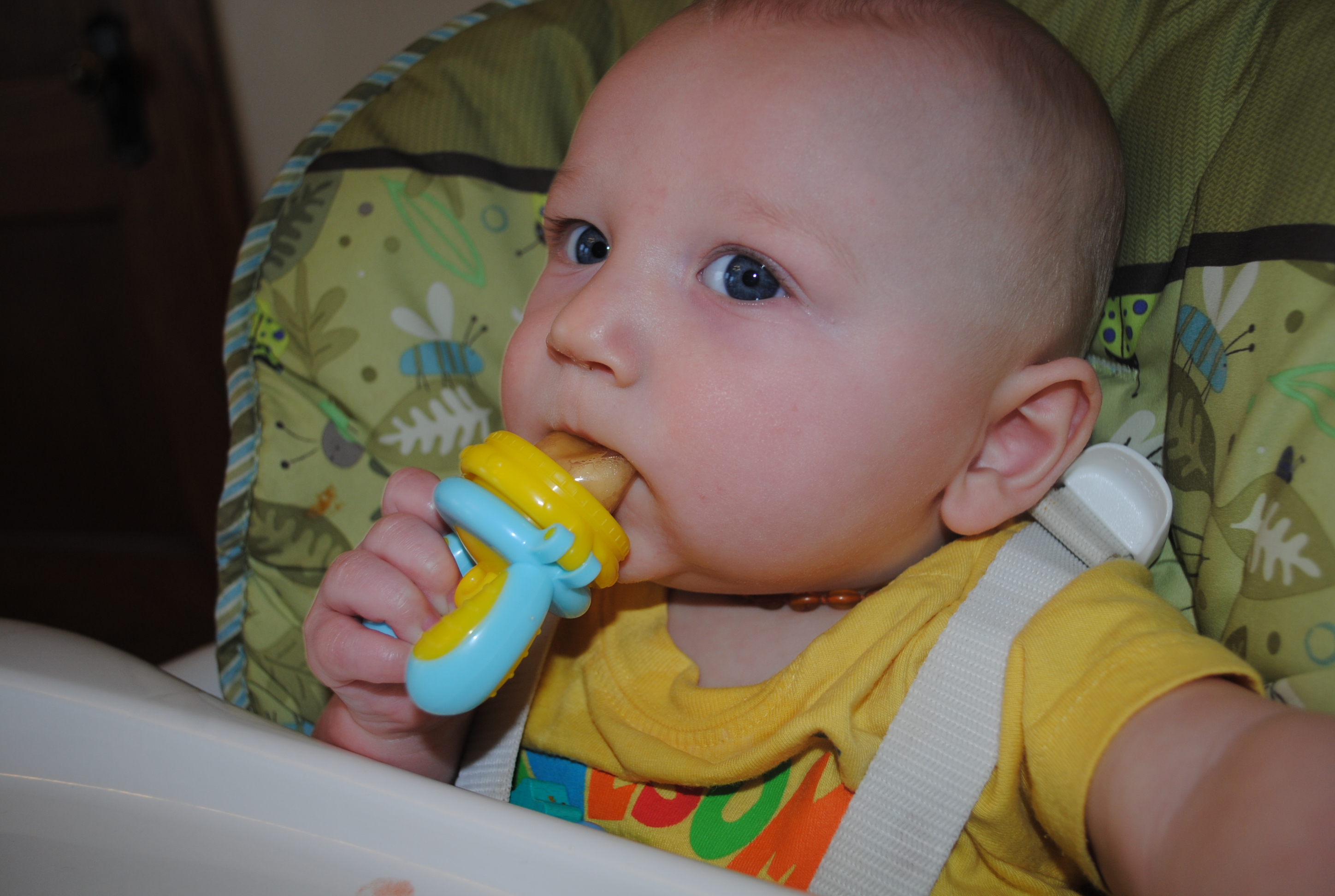 *Eats 5 times a day still. We are slowly weaning his last bottle (5oz), and trying to push back his 7:00 feed to closer to bedtime (8:00).