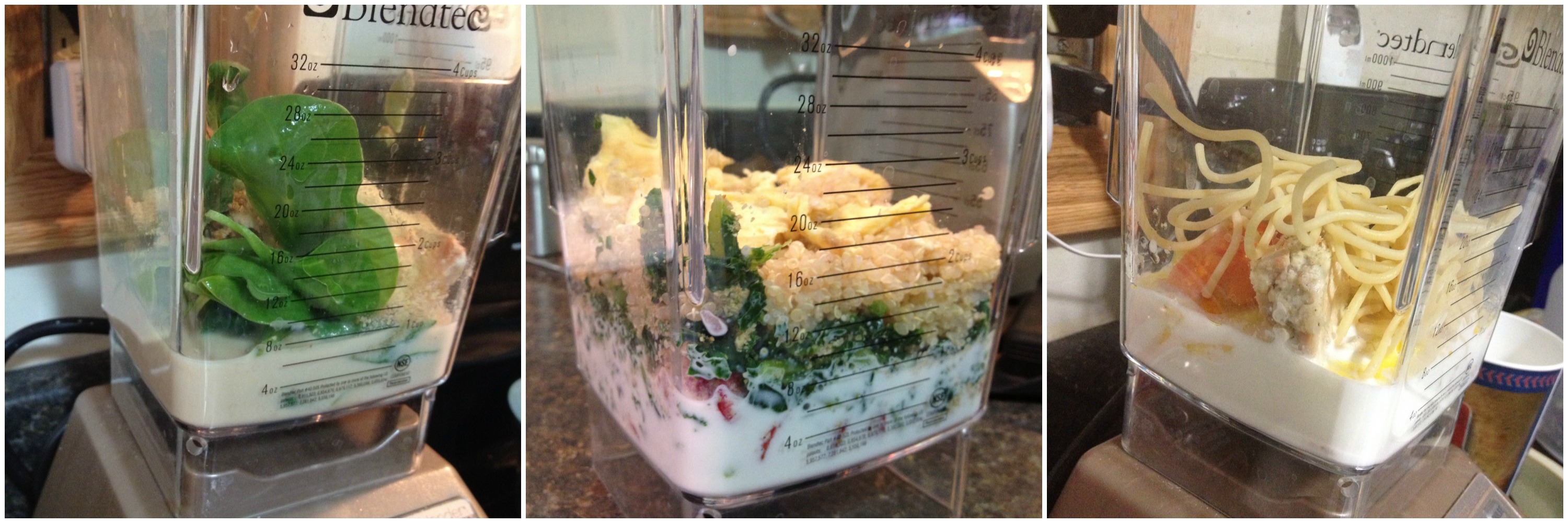 I’m still learning what works and what doesn’t… For example, I used sweet potato and pasta in a few blends. The starches in both made an incredibly thick blend. I then have to thin with a lot of water, which increases the volume– for Sam, not such a good thing! So those days we had to feed him after he went to bed a few times and get up at 5am to make sure he got all his calories. He just gets to sleep through it all, lucky guy 🙂