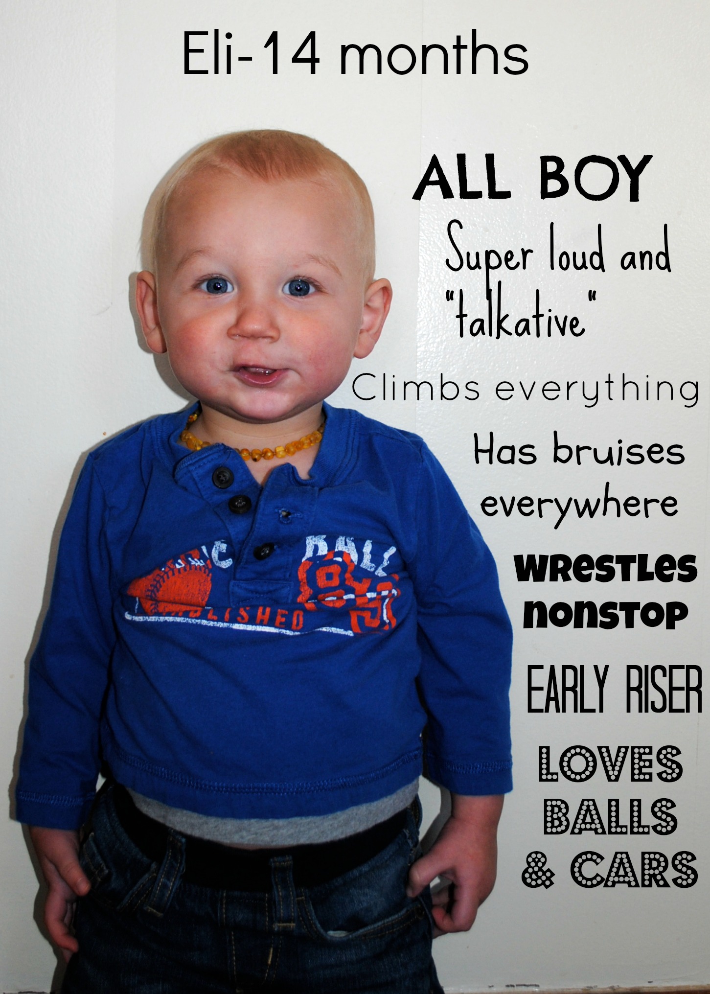 This boy… This boy is 110% BOY. While the twins have never been too into sports, this kid is never happier than when he’s holding or throwing a ball. He eats like a garbage disposal, is always messy, and loves to irritate the dog. He also loves to irritate his brothers π Jumping is a new favorite– we have a trampoline and he loves to get on there and jump.