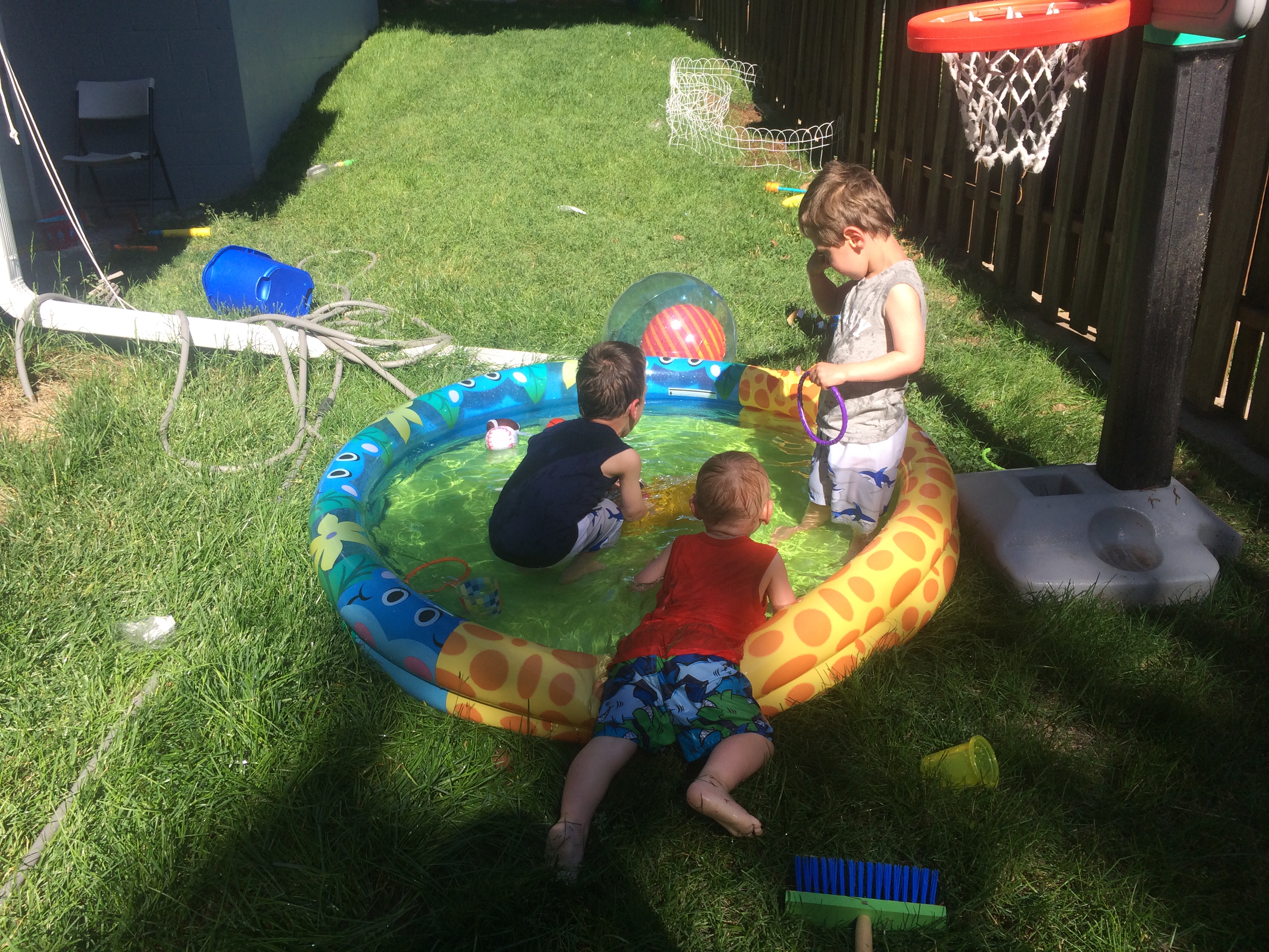Here are some pictures and video–the pool one cracks me up! Grandma Peggy just bought us a bigger pool–we definitely needed it! 🙂 Also, the sausage Sam is eating?! Umm… real kid-sized bites. Not itty bitty bites, but actual large bites. So excited for his progress.