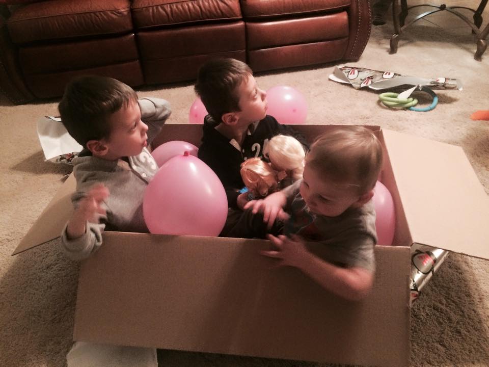 The day of the appointment also happened to be Adam’s 30th birthday! We found out together, and then headed home to leave for Fargo. As soon as we got back that night, Adam’s parents came over to my parent’s house for the big reveal! I had stuffed pink balloons into a big box. We had the boys open it:
